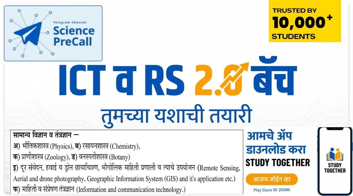Sci-Tech बॅच माहिती (ICT व Remote Sensing मॉड्यूल) Live बॅच सुरू: 14 जानेवारी 2026 अभ्यासाचा समावेश: ICT आणि Remote Sensing – 8 MCQ आधारित अभ्यासक्रम पूर्ण कव्हरेज प्रवेश: Unlimited Views – कितीही वेळा पाहता येईल संपर्क: शंका असल्यास 9503562529 या नंबरवर संपर्क साधा टीप: एकदा भरलेली फी परत केली जाणार नाही.