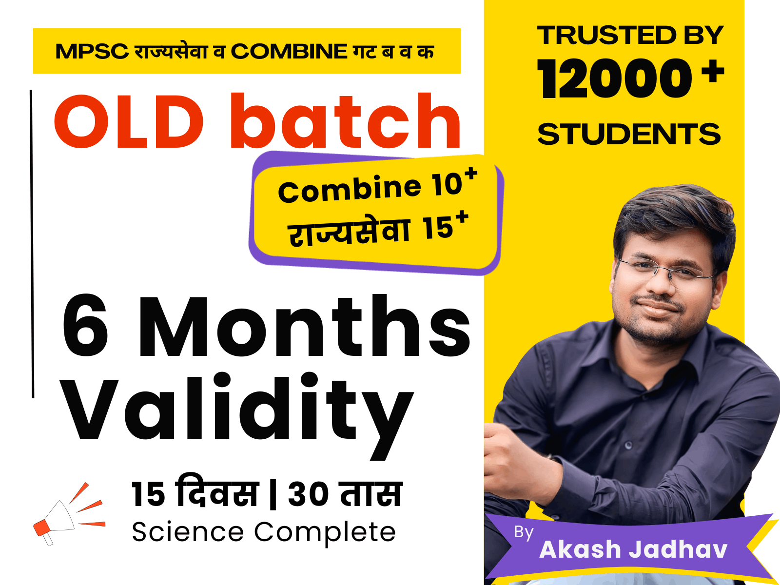 Science by Akash Jadhav. Validity : 6 Months Science PreCall Target Batch MPSC Combine पूर्व परीक्षेसाठी विज्ञानाचा झपाट्याने अभ्यास! केवळ १५ दिवसांत संपूर्ण विज्ञान विषय पूर्ण करा – घटकानुसार व्यवस्थित व मुद्देसूद तयारी. या बॅचमध्ये मिळणारे फायदे: ✅ फिजिक्स, केमिस्ट्री, बॉटनी, झूलॉजी, हायजीन यांचे संपूर्ण कव्हरेज ✅ दररोज व्हिज्युअल माइंडमॅप्स, ट्रिक्स व स्मार्ट रिव्हिजन ✅ 2024-25 अपडेट्ससह संपूर्ण परीक्षाभिमुख तयारी ✅ सोपी उदाहरणं, स्पष्ट संकल्पना आणि लक्षवेधी मांडणी बॅच मोड: ऑनलाइन (PDF / Telegram / Live मार्गदर्शन) शुल्क: अतिशय माफक भाषा: द्विभाषिक (मराठी + English) टीप: एकदा फी भरल्यानंतर ती कोणत्याही परिस्थितीत परत केली जाणार नाही. कोणासाठी उपयुक्त? MPSC Combine परीक्षेत विज्ञानात 65+ गुणांचा टार्गेट ठेवणाऱ्या विद्यार्थ्यांसाठी विशेष फायदेशीर! सीमित जागा – आजच जॉइन करा आणि अभ्यासात कमाल करा! Contact: Akash Jadhav – 9503562529