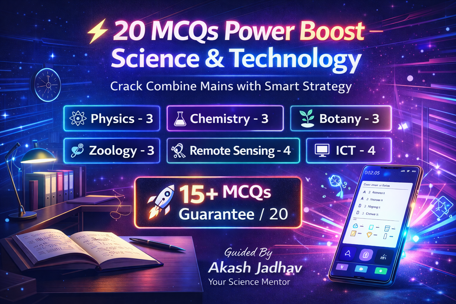 Combine गट ब व क मुख्य परीक्षा – Updated & Targeted Batch मुख्य परीक्षेतील Paper–2 मध्ये निर्णायक ठरणाऱ्या 20 MCQs साठी खास तयार केलेली बॅच. 📌 Batch Coverage (Exactly as per Mains Trend) 💻 ICT & Remote Sensing (RS) ➡️ 8 MCQs – Static + Current relevance ➡️ Frequently asked concepts & applications 🧪 General Science – 12 MCQs Physics – 3 MCQs Chemistry – 3 MCQs Botany – 3 MCQs Zoology – 3 MCQs 👉 Total 20 MCQs ची focused, mains-oriented तयारी 🎯 Why Science PreCall 2.0? मुख्य परीक्षेतील Paper-2 मध्ये 15+ Marks secure करण्यासाठी अत्यंत उपयुक्त Unnecessary theory नाही, exam-utility first approach Concept + MCQ solving + examiner mindset 📺 Batch Format ✅ Live + Recorded ✅ Recorded lectures available after live session ✅ Unlimited Views ⏳ Validity Options 🔹 6 Months 🔹 3 Months 🔹 1 Month (आपल्या exam timeline नुसार निवड करता येईल) ⚠️ Important Note एकदा pay केलेली fees कोणत्याही परिस्थितीत वापस केली जाणार नाही.
